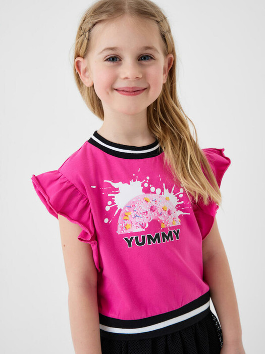 Детская футболка для девочки. Модель свободного кроя, выполнена из эластичного хлопкового трикотажа джерси. На груди расположен красочный принт с изображением пончика. Горловина и низ изделия, обработаны эластичным рибом. Рукава - крылышки.
