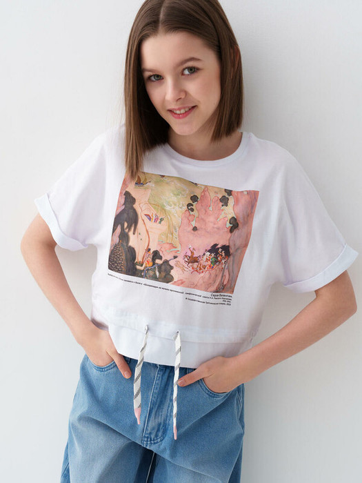 Футболка оверсайз для девочки подростка. Модель выполнена из хлопкового трикотажа джерси, спереди украшена красочным художественным принтом Валентина Серова — эскиз занавеса к балету «Шехеразада», созданный в 1910–1911 годах. Внизу  — кулиса со шнурком, который позволяет регулировать посадку.