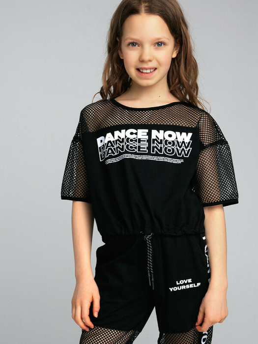 Футболка укороченная из качественного и приятного на ощупь трикотажа джерси с декором из сетки. Высокое содержание хлопка 95%, а благодаря наличию эластана в составе ткани, изделие проще в уходе и держит форму.