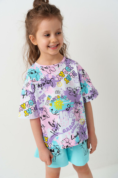 Детская футболка для девочки. Модель прямого кроя, выполнена из эластичного хлопкового трикотажа джерси. Украшена яркими принтами с милыми животными.