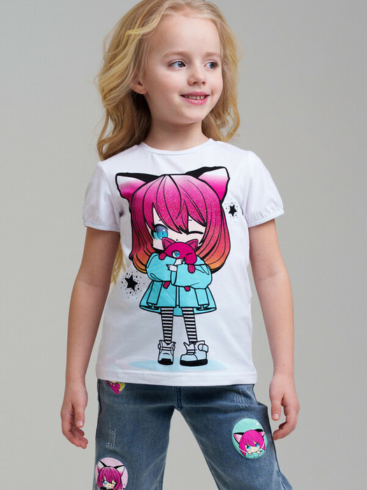 Футболка детская модная. Модель из качественного и приятного на ощупь трикотажа джерси. Футболка с высоким содержанием хлопка 95%. Благодаря наличию эластана в составе ткани изделие проще в уходе и держит форму.  Модель из капсульной коллекции CATS DREAM. Соберите полный образ в едином стиле!    Модель выполнена из качественного и приятного на ощупь трикотажа.