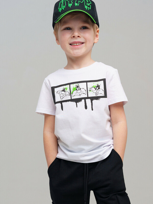 Футболка детская для мальчика. Высокое содержание хлопка. Благодаря наличию эластана в составе ткани изделие держит форму и меньше мнется. Модель выполнена из качественного и приятного на ощупь трикотажа.