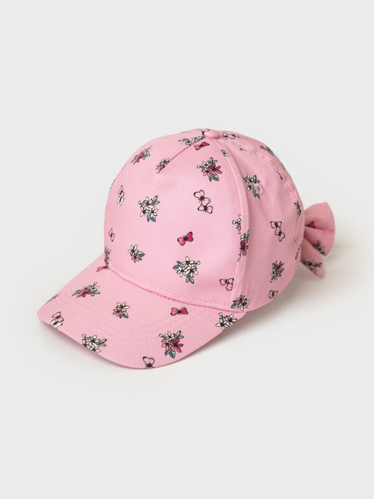 Детская бейсболка для девочки. Модель выполнена из мягкой розовой ткани с нежным принтом — мелкие цветочки, ягодки и бабочки украшают всю поверхность. Сзади — красивый бантик, который придает изделию нарядный и игривый вид. Бейсболка хорошо сидит на голове благодаря мягкой резинке, вшитой в затылочную часть. Для вентиляции предусмотрены люверсы.