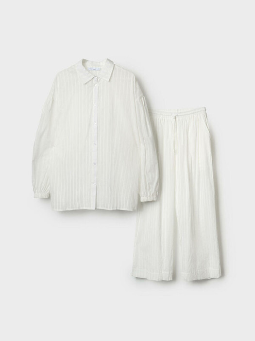 Легкий женский хлопковый костюм. Рубашка свободного прямого кроя с застежкой на пуговицы. Классический воротник и разрезы по бокам. Манжеты на резинке. Широкие брюки палаццо на резинке со шнурком для регулировки. Удобные боковые карманы.