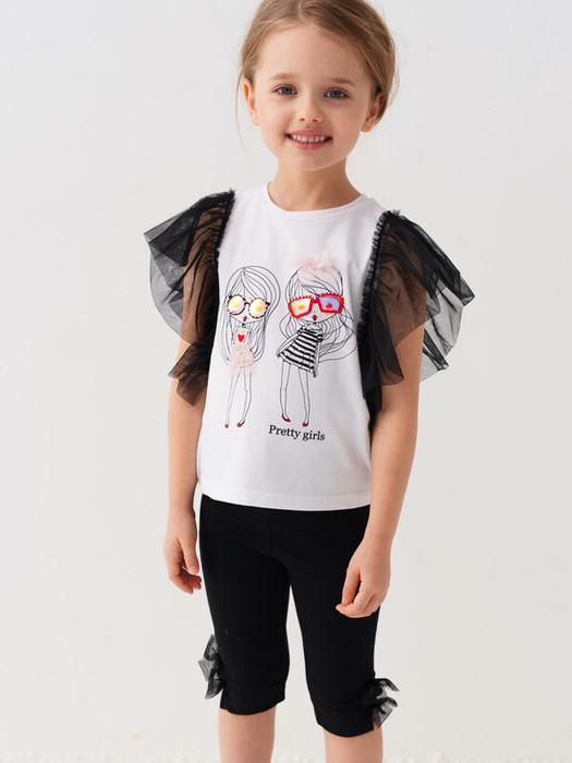 Детский комплект для девочки. Состоит из футболки и укороченных легинсов из хлопкового трикотажа джерси. Футболка прямого кроя, с ярким принтом на груди. Рукава-крылышки выполнены из лёгкой сетки, что придаёт изделию нарядный и модный вид. Легинсы чёрного цвета, укороченной длины, плотно прилегают по фигуре. В поясе — удобная эластичная резинка. По низу легинсов расположены декоративные бантики с вставками из сетки, которые перекликаются с дизайном рукавов футболки.