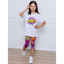 Легкий комплект для девочки подростка. Выполнен из мягкого хлопкового трикотажа джерси, состоящий из укороченной футболки и юбки-шорт. Футболка свободного кроя с ярким принтом. Пышная юбка на резинке с воланами, внутри имеет удобные шорты, что делает модель практичной для активного отдыха.