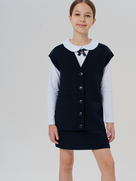 Этот элегантный костюм в темно-синем цвете отлично подойдет для школьницы и станет универсальным вариантом в школу или для повседневной носки.
