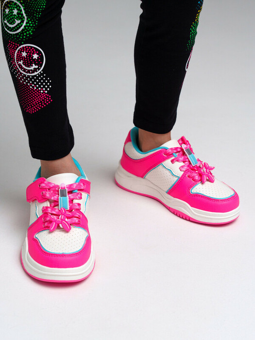 Кроссовки из искусственной кожи. В кроссовках используется текстильная подкладка с высоким содержанием хлопка. Кожаная профилированная стелька с анатомической формой обеспечивает правильную нагрузку на стопу. Модель имеет оригинальную застежку: шнурки через ремешок на липучке. Нет необходимости развязывать шнурки каждый раз. Достаточно их отрегулировать и дальше пользоваться липучкой. Съемные аксессуары клипсы на шнурках можно при желании переставлять или заменять на другие. Эргономичная форма колодки обеспечивает правильное формирование стопы ребенка. Формоустойчивый задник поддерживает стопу в правильном положении. Подошва из термопластичной резины не скользит и устойчива к истиранию.