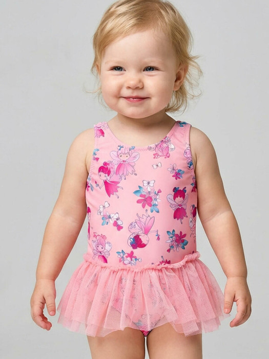 Детский слитный купальник для девочки. Выполнен в розовом цвете с ярким принтом с феями и цветами. Модель с открытой спинкой и декоративными резинками. По талии пришита пышная юбочка из воздушной сетки. Внутри подкладка. Все края обработаны эластичной тесьмой, чтобы изделие хорошо сидело на теле и не натирало. Благодаря UF-защите, ткань сохраняет первоначальный вид даже при длительном пребывании на солнце. Подходит для плавания и активного отдыха.