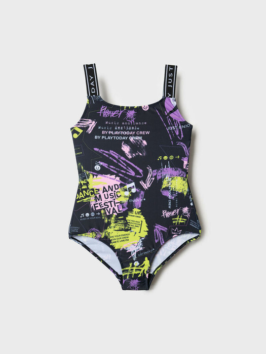 Купальник слитный для девочки подростка. Модель с открытой спиной и широкими лямками из черной жаккардовой ленты. Купальник украшен ярким принтом в стиле граффити: надписи, смайлики и элементы уличной культуры на черном фоне с яркими акцентами. Внутри предусмотрена подкладка, снизу — хлопковая вставка для комфорта. Со 146 размера предусмотрены мягкие съемные чашки. Края изделия обработаны эластичной тесьмой, чтобы купальник хорошо сидел и не натирал. Благодаря UF-защите, ткань сохраняет первоначальный вид даже при длительном пребывании на солнце. Подходит для активного отдыха и плавания.