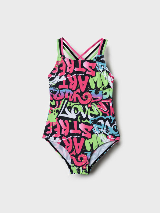 Слитный купальник для девочки подростка. Основной акцент сделан на разноцветный принт в стиле граффити с надписями, брызгами и контрастными цветами: розовый, салатовый, голубой, чёрный и белый. Купальник с эффектными переплетёнными бретелями на спине. Внутри предусмотрена двойная подкладка с чашечками для комфортной посадки. Все края аккуратно обработаны эластичной тесьмой. Модель разработана для активного летнего отдыха и плавания.