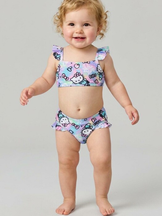 Раздельный детский купальник для девочки. Состоит из укороченного топа и классических плавок. Воланы на лямках и по бокам плавок, которые придают образу легкости. Модель с красочным градиентом и ярким принтом Hello Kitty. По краям изделия используется мягкая эластичная тесьма для комфортной посадки. Купальник украшен милыми деталями — конфетами, сердечками, бантиками и логотипом Hello Kitty. Благодаря UF-защите, ткань сохраняет первоначальный вид даже при длительном пребывании на солнце. Подходит для плавания и активного отдыха.