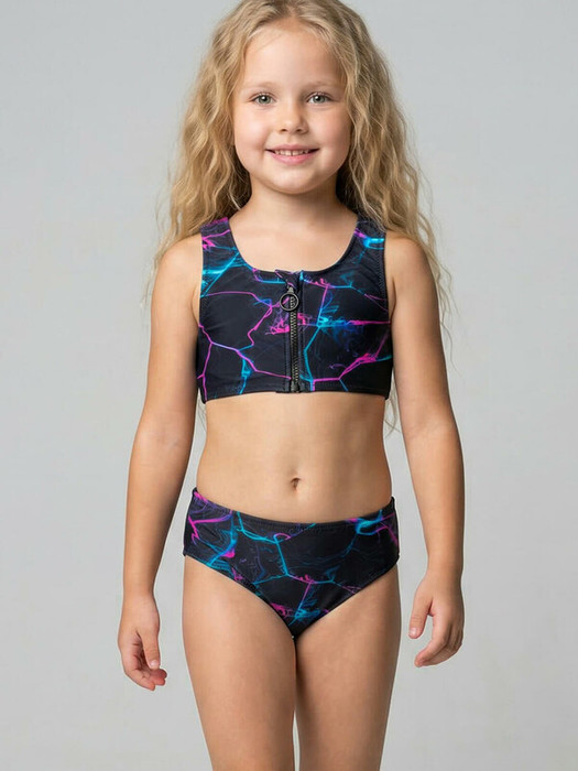 Купальник раздельный для девочки подростка. Топ застёгивается спереди на молнию и имеет съемные чашечки для лучшей поддержки. Вырез горловины круглый, с широкой проймой. Плавки классического кроя, хорошо сидят по фигуре. Внутренняя часть купальника выполнена на подкладке. Принт – яркий и необычный: дымчатые линии в неоновых оттенках розового, бирюзового и фиолетового на черном фоне. Все края обработаны эластичными лентами, что обеспечивает удобство при носке и хорошую посадку. Благодаря UF-защите, ткань сохраняет первоначальный вид даже при длительном пребывании на солнце. Подходит для плавания и активного отдыха.