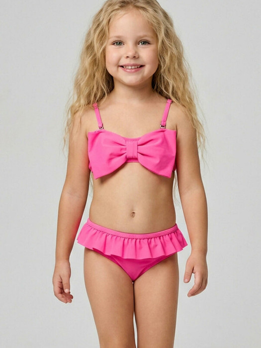 Купальник раздельный детский для девочки. Состоит из топа и плавок, выполнен в ярко-розовом цвете. Главный акцент — крупный бант на топе, а также декоративные рюши по линии талии плавок. Топ фиксируется сзади на завязки, а съемные регулируемые бретельки крепятся на прозрачные пластиковые элементы. Плавки дополнены внутренней подкладкой и эластичными вставками для удобства. Благодаря UF-защите, ткань сохраняет первоначальный вид даже при длительном пребывании на солнце. Подходит для плавания и активного отдыха.