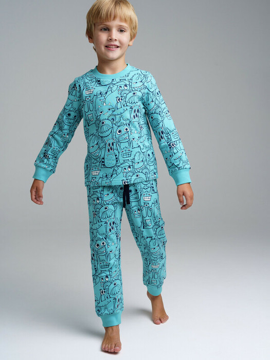 Пижама детская из футера с начесом для мальчика: свитшот и брюки из трикотажа. 100% хлопок. Брюки на резинке со шнурком. Эластичные манжеты по рукавам и низу брюк.