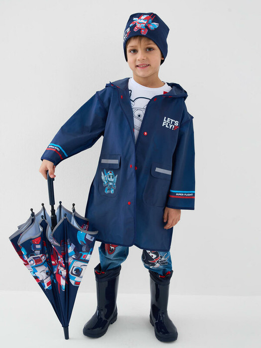 Дождевик детский с козырьком для мальчика. Застежка на кнопки. Материал ЭВА. Без подкладки. Модель имеет спереди два накладных кармана с клапаном. Сзади имеется объемный клапан на кнопках для изменения объема плаща под рюкзак. Есть светоотражающие элементы спереди, сзади и на рукавах. Добавлена петелька под капюшоном с внешней стороны, чтобы остальные вещи на вешалке не намокали. Модель идеально  сочетается с резиновыми сапогами и зонтом из коллекции. В комплекте идет непромокаемая сумочка.