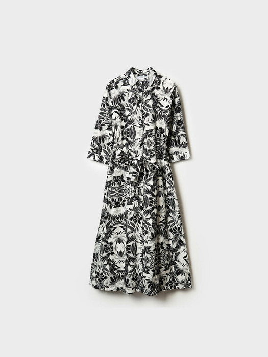 Женское платье в длине макси. Модель выполнена из хлопковой ткани, имеет прямой верх и расширенную к низу юбку, за счёт чего красиво смотрится в движении. Платье застёгивается на пуговицы. Линия талии подчёркивается съёмным поясом. Рукава длинные, с манжетами на пуговицах. По бокам предусмотрены удобные карманы. Воротник классический, отложной.