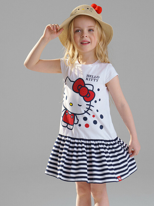 Платье трикотажное с принтом Hello Kitty. Высокое содержание хлопка 95%. Благодаря наличию эластана в составе ткани изделие держит форму и меньше мнется.
