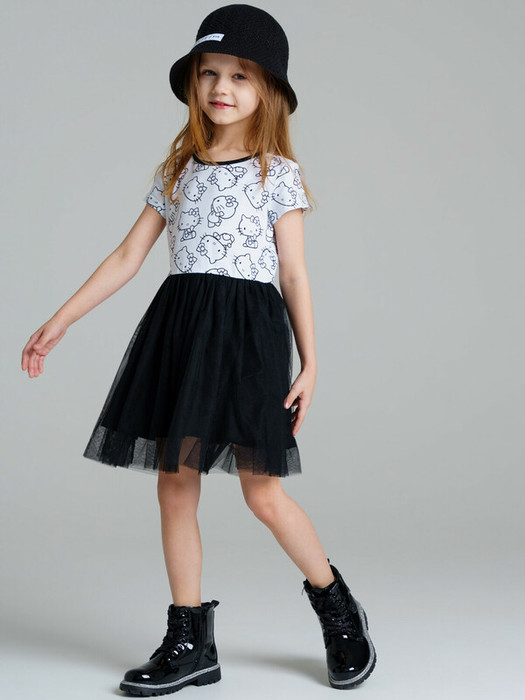 Платье из качественного и приятного на ощупь трикотажа джерси. Высокое содержание хлопка 95%. Благодаря наличию эластана в составе ткани изделие проще в уходе и держит форму. Юбка из сетки.