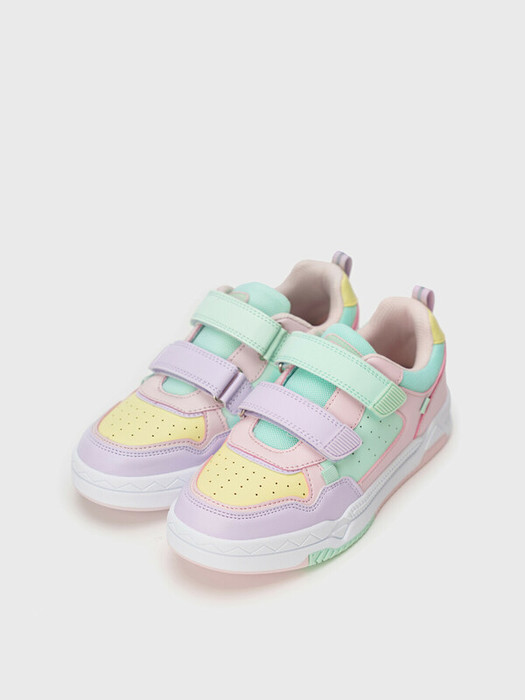 Трендовые кеды колор-блок для девочки подростка. Кроссовки  выполнены из искусственной кожи, обладающей высокими эксплуатационными свойствами, и текстиля в качестве отделки. Профилированная съемная стелька из свиной кожи с анатомической формой подсводника обеспечивает правильную нагрузку на стопу. В носочной части обуви стоит текстильная подкладка c высоким содержанием хлопка 80%, которая обладает высокой гигроскопичностью. В пяточной части обуви текстильная подкладка обладает хорошей износостойкостью. Две липучки создают удобство при обувании и надежно фиксируют ногу. Формоустойчивый задник поддерживает стопу в правильном положении. Эргономичная форма колодки обеспечивает правильное формирование стопы ребенка. Подошва из ТПР не скользит и устойчива к истиранию.