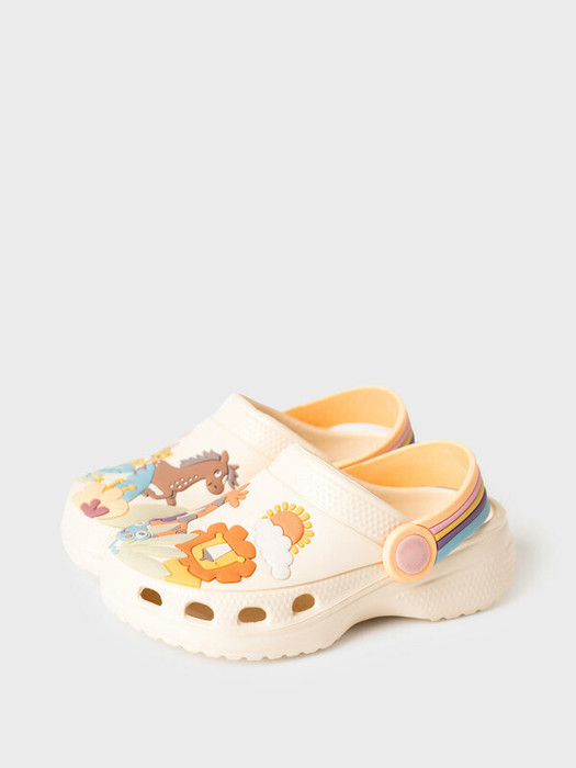Сабо детские для девочки. Сабо из облегченного и прочного ЭВА. Материал хорошо моется. Объемный рисунок на правой и левой полупарах рассказывают нам целую историю из мира животных. Форма модели учитывает эргономику стопы. Модель имеет  перекидной ремешок для лучшей фиксации обуви на ноге. Благодаря вентиляционным отверстиям сабо проветриваются, ноги ребенка дышат и не потеют.