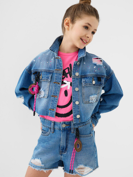 Джинсовые шорты для девочки подростка. Застежка на молнию и болт. На талии — пояс со шлёвками и внутренней резинкой с пуговицей для удобной регулировки. Карманы спереди и сзади. Модель с высокой посадкой и модной укороченной длиной. Края шорт оформлены рваной бахромой, что придаёт изделию стильный и дерзкий вид. В комплекте — съёмная декоративная подвеска с яркой розовой биркой на шнурке.