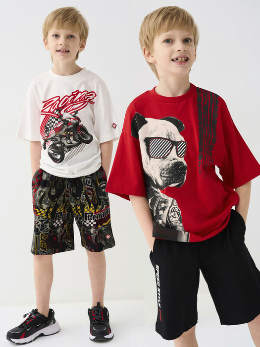 Набор спортивных шорт для мальчика подростка. Шорты выполнены из мягкого трикотажа с эффектным принтом: пламя, шлем гонщика, надписи "PLAYTODAY RACING", "SPEED STYLE PTO", и графика в стиле мотоспорта. Модель средней длины, с удобным эластичным поясом и шнурком. Есть два боковых кармана. Внизу — фирменная нашивка. Отличный выбор для активных подростков, которые любят яркий и смелый стиль.