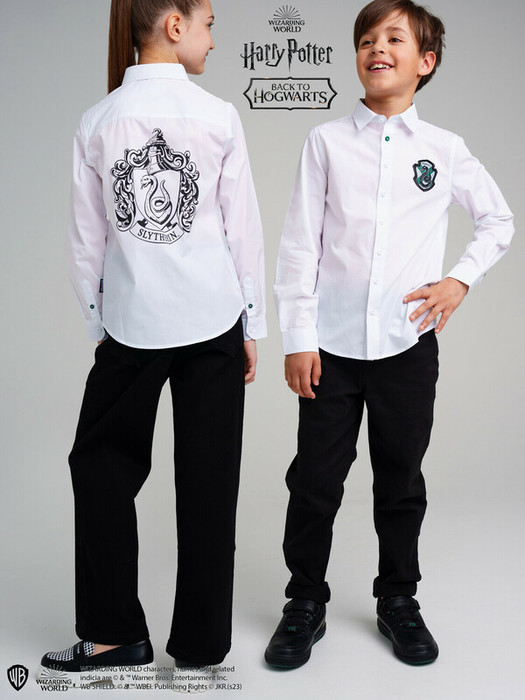 Лицензионный товар из коллекции Back to Hogwarts по франшизе "Гарри Поттер" (Warner Bros.) с эмблемой факультета Слизерин. Белая школьная рубашка с длинным рукавом  - настоящая база гардероба для школьника! Классическая рубашка выполнена из ткани с высоким содержанием хлопка, что обеспечивает максимальный комфорт для мальчика подростка во время занятий. Рубашка классического силуэта на пуговицах станет отличным решением для школы, как на каждый день, так и для торжественных случаев. Сорочка может быть дополнена стильным галстуком или бабочкой для создания завершенного образа в школу. Строгая, лаконичная, элегантная рубашка создаст ребенку учебный настрой.