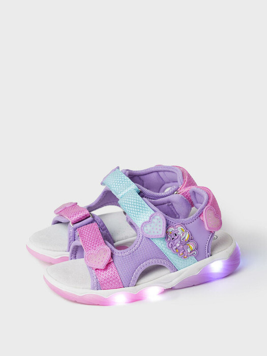 Сандалии для девочки с открытой носочной и пяточной частью выполнены в стиле колор-блок. Сандалии выполнены из искусственной кожи и дышащего текстиля и декорированы патчем единорогом. Стелька выполнена из натуральной кожи. Текстильная подкладка c высоким содержанием хлопка 80% обладает высокой гигроскопичностью. Удобные возвратные ремни с липучками позволяют регулировать обувь на любой подъем. Подошва из ТПР имеет LED-подсветку.