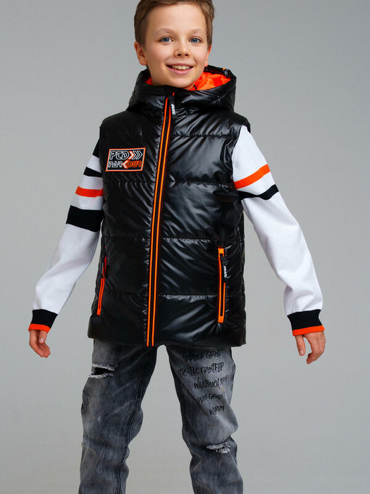 Жилет утепленный для мальчика. Температурный режим до +10°С*. Линия температурного режима X-LIGHT. Идеально подходит для весны и теплой осени. Материал верха с ветрозащитным и водоотталкивающим покрытием. Гладкая подкладка максимально комфортна для надевания изделия. Внутренняя ветрозащитная планка. Два боковых кармана на молнии. Внутренний карман на липучке. Капюшон несъемный, регулируемый утяжкой. Низ изделия регулируется утяжкой.
