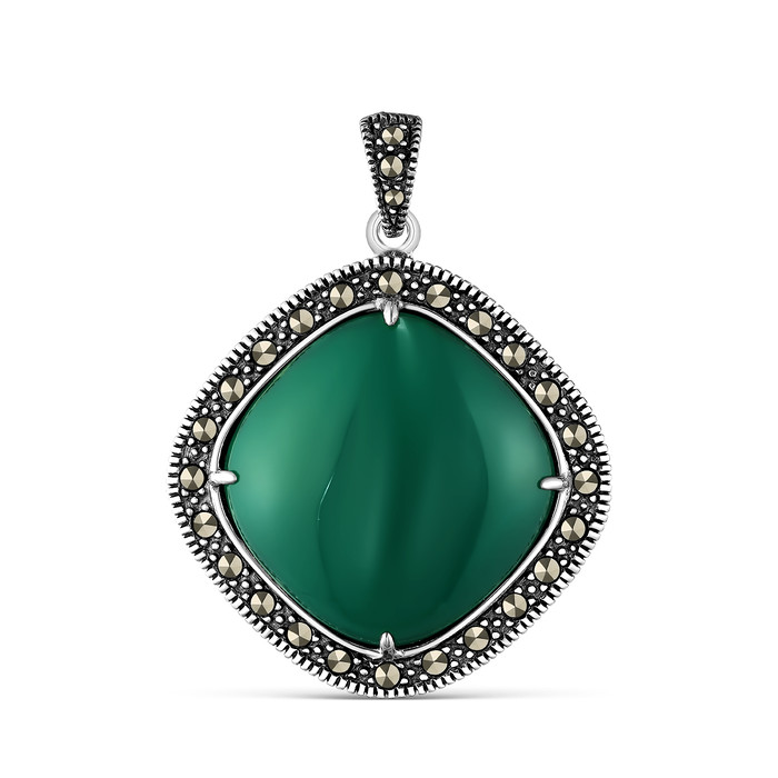 Подвеска из чернёного серебра с нат.зелёным агатом и марказитами 925 пробы MN009