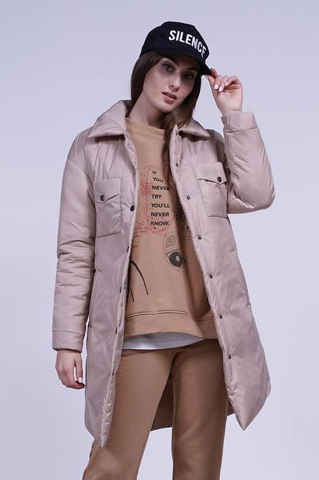 Чрезвычайно популярной моделью является удлиненное женское полупальто-рубашка. Данное изделие отмечается простотой и лаконичностью: отложной воротник, два нагрудных кармана, боковые карманы листочки, глянцевые фирменные кнопки, а также фигурный низ,это идеальный вариант для любого образа в холодную погоду. Длина пальто по спинке ок.91см. Длина рукава от горловины ок.74см. Рост 170 см Состав: полиэстер - 100%, утеплитель: Air Twin Light 100 г/m2 Р-ры 42-52 Цвет: беж Цвет одежды может незначительно отличаться от оригинала.