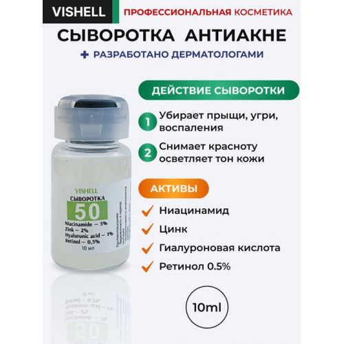 Многозадачная сыворотка с ниацинамидом, цинком, гиалуроновой кислотой и ретинолом. Идеально подходит для применения на коже в борьбе с акне, для омоложения проблемной кожи. На рынке представлено много сывороток с цинком и ниацинамидом в серии "анти акне" средств, но наша сыворотка уникальная. Мы разработали её с участием врачей дерматологов с учётом медицинских протоколов лечения акне. Самыми эффективными мед. препаратами для наружного применения против прыщей являются топические ретиноиды. В косметической промышленности самым эффективным из группы ретиноидов является ретинол, и мы нашли тот самый ретинол, который максимально эффективен при акне, его разработала испанская фирма Infinitec. "Анти акне ретинол" не просто борется с прыщами, комедонами за счет усиления эксфолиации, а его состав обладает сильнейшими антибактериальными свойствами. В сыворотке помимо ретинола содержится еще один компонент, который используется в мед. протоколах лечения акне - цинк, он подсушивает воспаления и также обладает антибактериальным действием. Ниацинамид — это водорастворимый витамин B3, активный компонент косметических средств нового поколения, в одиночку отвечающий за клеточное обновление кожи. Гиалуроновая кислота - всем известный увлажняющий актив. Сыворотка по настоящему лечебная. Назначение: выравнивает цвет лица, осветляет пост-акне, устраняет покраснения и воспаления. Эта сыворотка подходит для тех, кто страдает от частых воспалений, длительно заживающих акне.