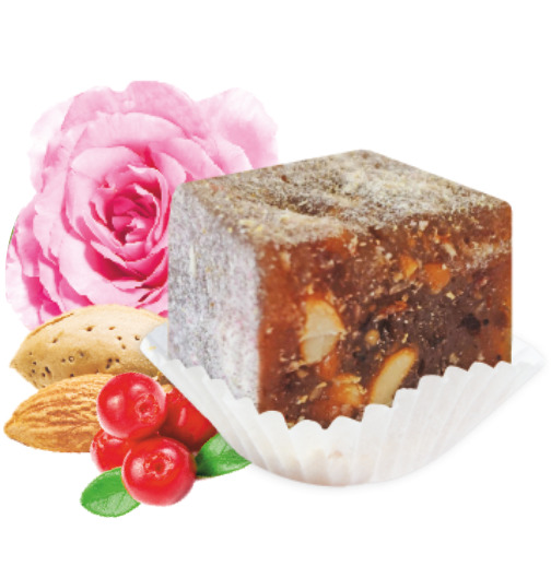 Состав:виноградный сок, сахар, патока, вода, клюква, изюм, крахмал кукурузный, миндаль, арахис, цикорий (пребиотик-инулин), гибискус, колючелистник, лепестки роз, кокос.