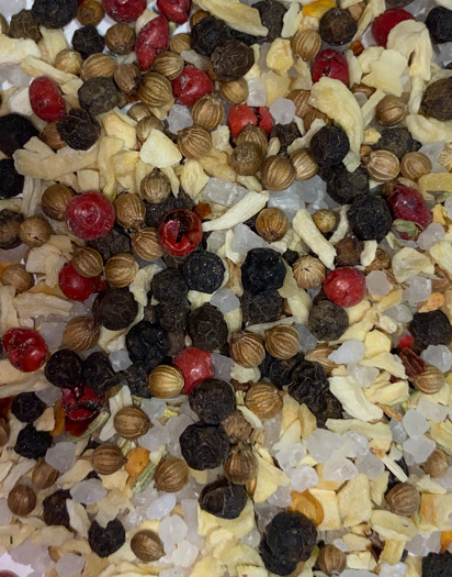 СОСТАВ: перец черный, розовый горошек, чеснок, кориандр, соль морская.