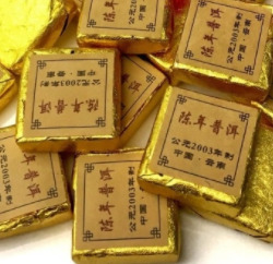 Шу Пуэр (черный) Юньнаньский Золотой Брикет 2003 в Подарочном мешочке. Урожай 2003 года. Изготовлен в 2018 году на фабрике Yunnan Runxiu Tea Industry Co.,Ltd. Хороший чай поступает из хорошего места происхождения. Это изысканый пуэр изготавливается из **почек и крупных листьев, что позволяет получить ЧА ЦИ. Вкусный и ароматный пуэр выделяется своим богатым вкусом и бесконечным сладким послевкусием**. Настой "Золотого брикета" имеет корчневый "шоколадный" оттенок. Многогранность вкуса и тонизирующий эффект в большей мере раскрывается при настаивании. В заваренном пуэре раскрывается древесный аромат со сладкими нотами чернослива. Вкус плотный с приятным карамельным послевкусием. Чай обладает всеми полезными для организма качествами: нормализует работу ЖКТ, улучшает обмен веществ, выводит токсины, снижает аппетит, тонизирует**.** Способствует похуданию. Юньнаньский Золотой Брикет 2003 способен для вас открыть Шу пуэр по новому и подарить яркое чайное состояние. Пейте с удовольствием!
