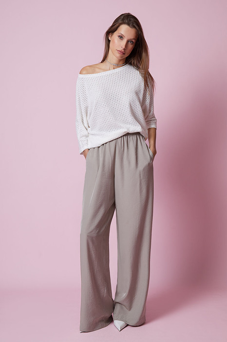 Прямые брюки-палаццо  из струящейся  вискозы с “мокрым” эффектом.  Брюки на широком  поясе, в который вставлена резинка. Функциональные  карманы в боковых швах. Эти брюки отлично сочетаются с топами, укороченными джемперами и свободными рубахами и блузами, а так же прекрасно дополняют образ в сочетании со свободным жакетом в стиле Casual.