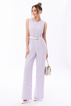 Стильный комбинезон полуприлегающего силуэта с расширенными книзу брюками из штапельной ткани. Горловина округлая. Брюки прямого силуэта со складками по переду и наклонными карманами. Лиф прямого кроя со сборкой по низу. По переду и спинке складки выходящие из плечевого шва. Плечо расширено, предусмотрены плечевые накладки. Лиф соединен с брюками притачным поясом с резинкой на уровне бокового шва и шлевками для ремня. По среднему шву спинки от горловины потайная молния. В комплект входит ремень. На все представленные размеры единая длина ремня, составляющая 120см.
