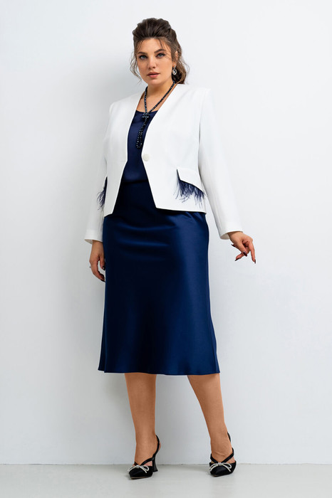 Красивый и стильный костюм тройка! Костюм создает роскошный образ уместный как для торжественных случаев, так и для романтических свиданий. Жакет полуприлегающего силуэта без воротника с застёжкой на одну петлю и пуговицу. По переду нагрудные и талиевые вытачки, придающие легкое приталивание и подчеркивающие фигуру. В качестве декоративной отделки съемная тесьма с перьями и настрочные клапаны. Спинка в жакете со средним швом без особенностей. Рукав втачной, двухшовный, длинный. Жакет на подкладке. Блузка прямого силуэта с округлым везом и нагрудными вытачками. Рукав втачной короткий. Спинка без особенностей. Юбка А-образного силуэта из плотной атласной ткани с умеренным блеском. Для максимального комфорта на эластичной ленте по талии. Длина жакета 56 см, длина рукава 60 см, длина юбки 81см. Длина блузки 63см, длина рукава блузки 30см.