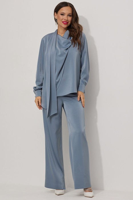 Элегантный комплект из блузы и брюк, выполненных из струящейся ткани средней плотности с атласным блеском. Блуза свободного кроя со слегка спущенным рукавом, дополненным притачной манжетой с застежкой на красивые пришивные пуговицы. Блуза дополнена притачным элементом, который драпируется вокруг горловины с помощью пришивных шлевок. По спинке застежка "капелька" на пришивную пуговицу. Брюки прямого кроя с притачным поясом, дополненным эластичной тесьмой. Застежка на потайную молнию и пуговицу. Длина блузы от плечевого шва 64см. Длина рукава 61см. Длина рукава 109см.