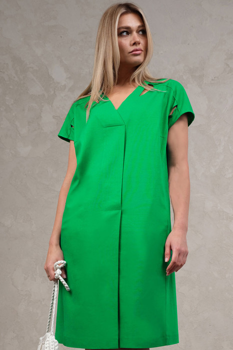 Платье повседневное, свободный силуэт до середины колена. С цельнокроенным коротким рукавом, V-образный вырез горловины, по переду складка имутирующая запах. В боковых швах карманы.