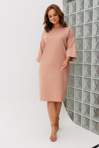 Платье женское, прямого силуэта. Вырез горловины по переду - "лодочка", по спинке V - образный. По переду рельеф, заканчивающийся разрезом, и волан, переходящий в горловину спинки. Волан обтачен тканью-компаньоном. В боковых швах карманы.