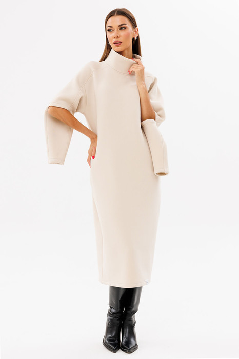 Теплое модное платье в стиле Kivvi wear. Платье с разрезами в рукавах на уровне линии локтя, карманами в боковых швах, рукавом реглан и воротником-стойкой. Платье выполнено из мягкой и теплой ткани, которая хорошо сохраняет тепло и не сковывает движения. Разрезы в рукавах придают платью оригинальность и позволяют носить его с разными аксессуарами, например, с браслетами или перчатками. Карманы в боковых швах - это удобный и практичный элемент, который позволяет хранить мелочи или согревать руки. Рукав реглан - это рукав, который начинается от воротника и идет до низа подмышки, создавая эффект объема и свободы. Воротник-стойка - это воротник, который поднимается над шеей и защищает от холода и ветра.