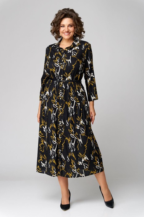 Нарядное, удлиненное женское платье из вискозной ткани с современным принтом. По переду планка с застежкой на мелкие декоративные пуговицы, воротник рубашечного типа, рукав 7/8 с