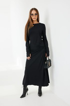 Платье женское полуприлегающего силуэта отрезное по линии талии. Лиф переда с нагрудными и талевыми вытачками. Горловина V-образная. По среднему шву спинки сверху застёжка потайная молния. Юбка расклешённая. Рукав одношовный втачной, по окату небольшая сборка. Низ рукава со сборкой на тонкие манжеты. Изделие дополняет пояс кушак. Платье без подкладки.