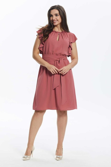Платье женское полуприлегающего силуэта, отрезное по линии талии, на резинке, без рукавов, выполнено из тонкой плательной ткани. Юбка, слегка расклешённая к низу. По переду застёжка на воздушную петлю и пуговицу. Горловина круглая с небольших рюшей. Широкие воланы от плеча до талии. Платье дополняет пояс. Платье на тонкой трикотажной подкладке.