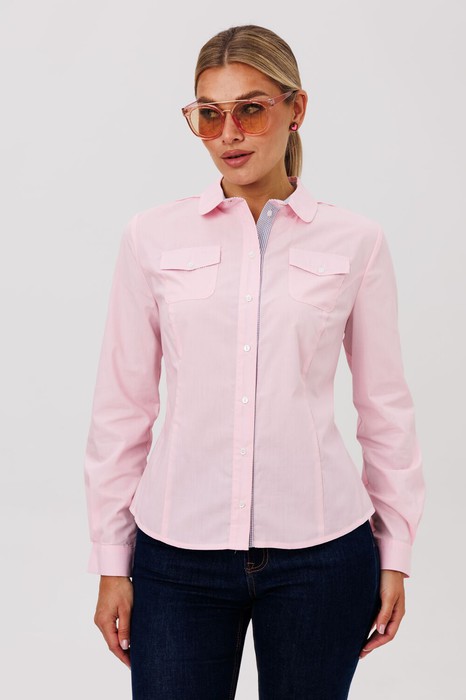 Классическая блуза полуприлегающего силуэта, создающая элегантный и утонченный силуэт. Модель сконструирована с талевыми вытачками по переду и спинке, что обеспечивает идеальную посадку по фигуре. Дополняют образ накладные карманы с аккуратными клапанами.