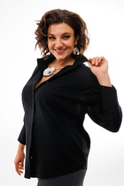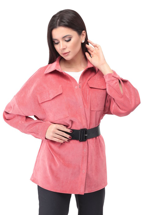 Рубашка женская, свободного кроя. Перед с нагрудными карманами и центральной застежкой на кнопки. Рубашка со спущенным плечом. Рукав длинный, втачной. Низ рукава с манжетой. Воротник втачной со стойкой. К рубашке прилагается съемная сумочка в цвет рубашки.