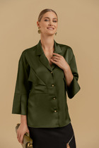 Рубашка свободного кроя выполнена из натурального полотна приглушенного голубого цвета. Характеристики: рубашка прямого свободного кроя, горловина стойка. Застежка центральная на петли пуговицы, рукав акцентный объёмный, крой рукава летучая мышь, спинка отрезная с декоративной сборкой. Длина по спинке 80 см, длина рукава от горловины 76 см.