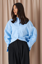 Рубашка прямого кроя, выполнена из ткани голубого цвета. Характеристика: свободный крой, отложной воротник, центральная застежка на пуговицы, по переду фигурная кокетка, рукав втачной, со спущенной линией плеча, с широкой манжетой, на мажете пугвица, отрезная спинка с кокеткой. Длина рукава открая горловин 78см. Длина по спинке 70 см